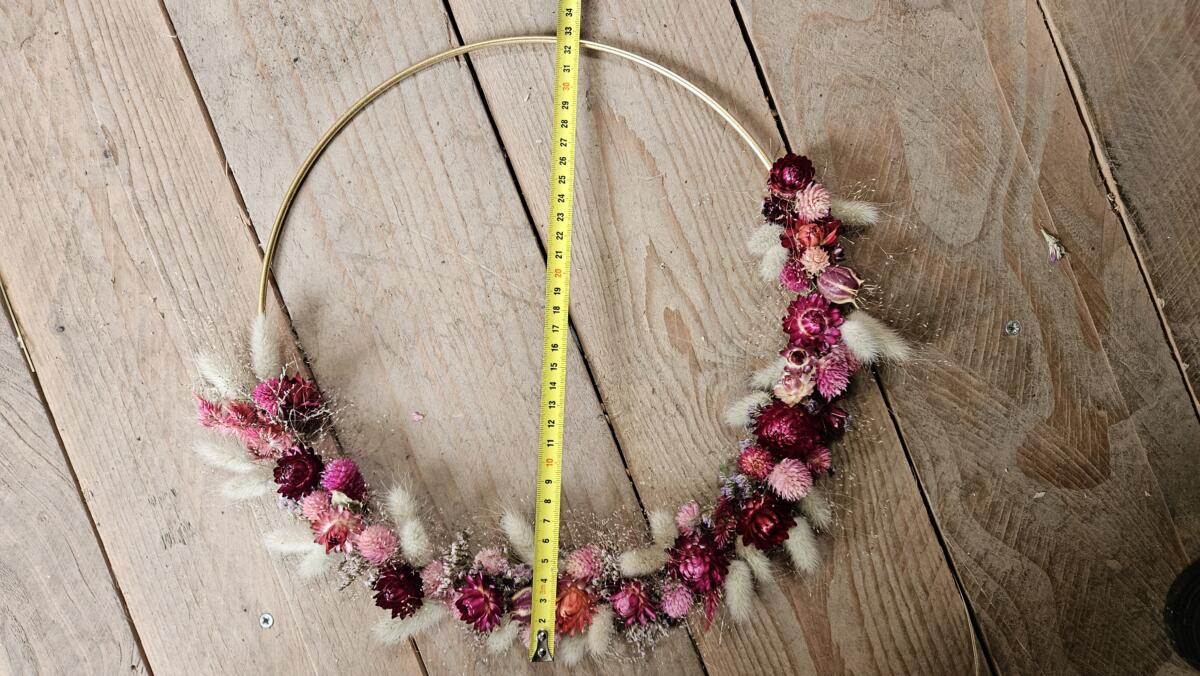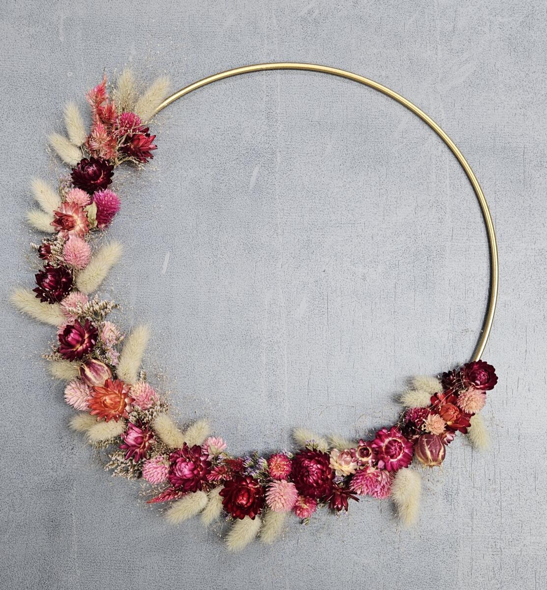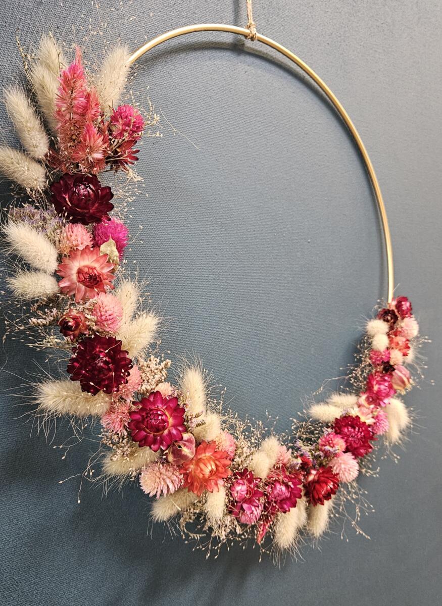 Cercle de fleurs séchées, création artisanale durable pleine de poésie.
